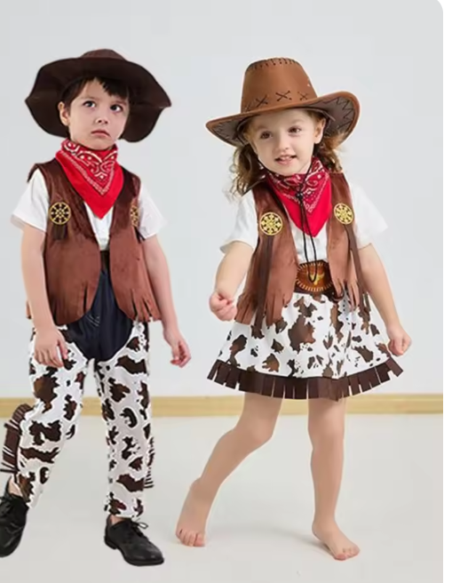زي تنكري للأطفال على طراز رعاة البقر الغربي لحفلات الهالوين، ملابس للأولاد والبنات للحفلات المدرسية والعروض