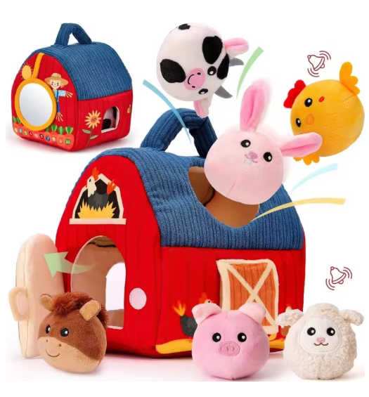 صندوق ألعاب الحظيرة المحمول على شكل دمية صغيرة للمزرعة مع حيوانات ناعمة مملوءة من مونتيسوري للأطفال الصغار هدية عيد ميلاد